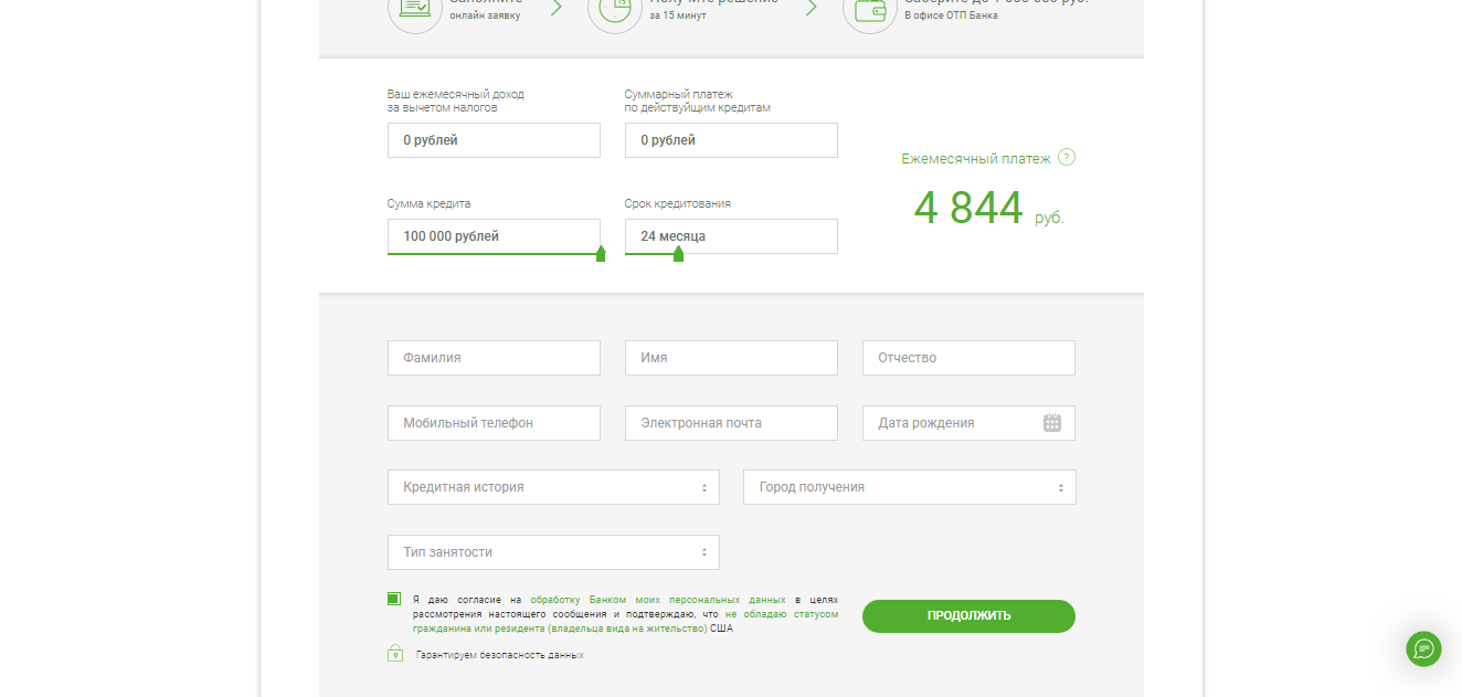 Для удобства клиентов технический отдел банка «ОТП» разработал удобный онлайн-сервис. Кредитный помощник позволяет сделать предварительный просчет будущего кредитного займа с учетом индивидуальных особенностей, а также выполняет функцию онлайн-заявки на получение кредита. Чтобы выполнить просчет, необходимо придерживаться такого алгоритма действий: