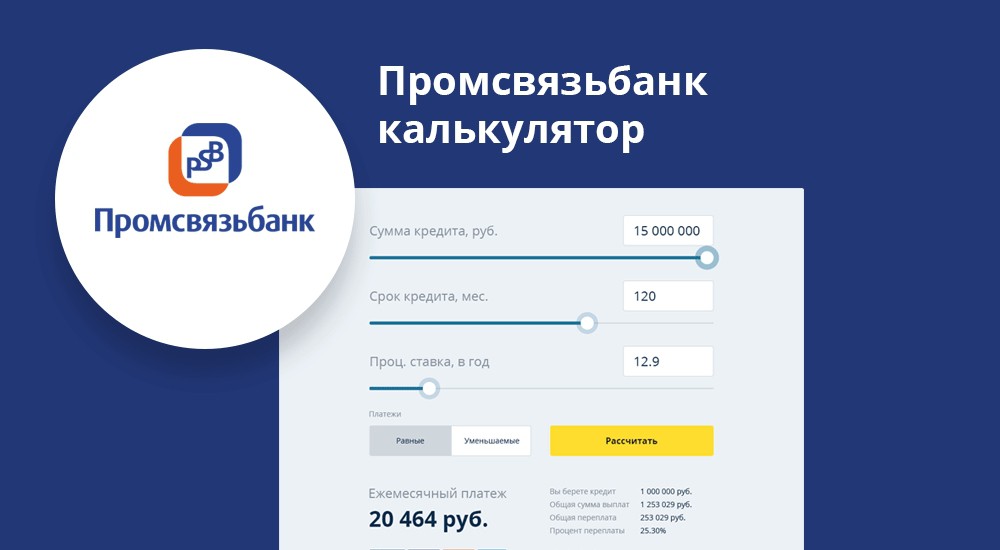 Промсвязьбанк входит в десятку лучших банков в России. Своим клиентам он предлагает большое количество услуг и сервис европейского уровня. Отдельно стоит отметить политику кредитования, которая отличается выгодными условиями и ориентированностью на различные категории граждан. В этой статье мы подробно рассмотрим преимущества кредитов Промсвязьбанка, а также расскажем, как рассчитать кредит в режиме онлайн.