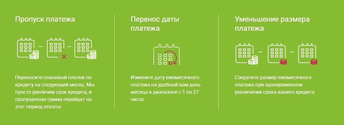 - «Изменение даты платежа» - предоставляет возможность клиентам вносить изменения в дату ежемесячного платежа, установленную в графике платежей, на любую из периода от 1 до 27.