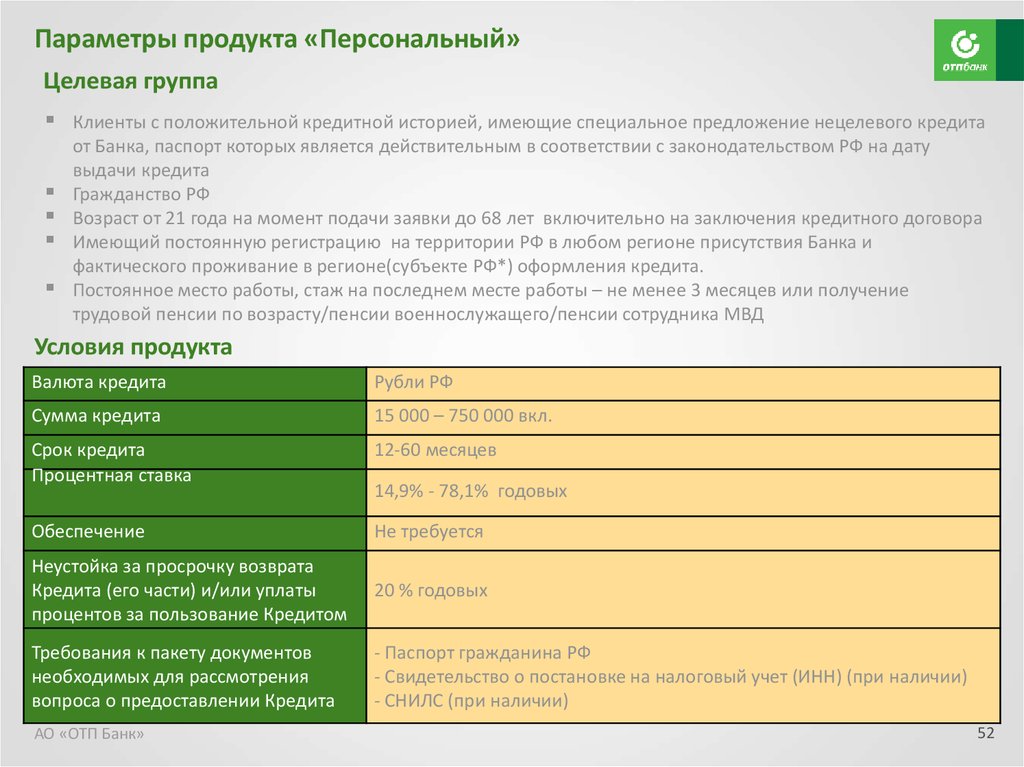 - Заемщик должен быть прописан и фактически проживать в регионе, где функционирует хотя бы одно отделение «ОТП».