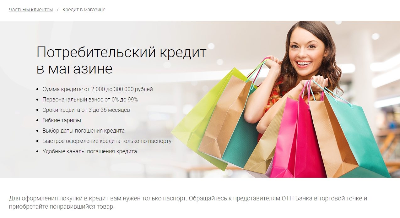 Помимо перечисленных видов кредитного займа, клиенты «ОТП» также имеют возможность оформить потребительский кредит в магазине. Оформление такого вида кредитного займа возможно в любой торговой точке, которая является официальным партнером банка.