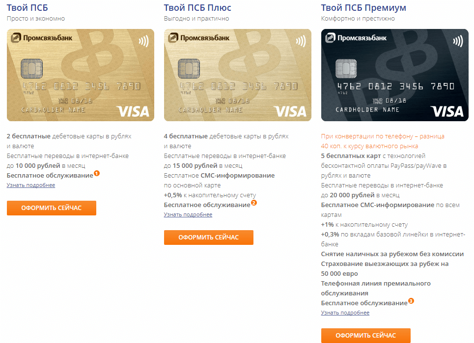 Основным финансовым инструментом для быстрого перевода средств, а также оплаты товаров и услуг является дебетовая карта. В «Промсвязьбанке» существует 8 видов дебетовых карт, каждая из которых включает в себя базовый тариф обслуживания.