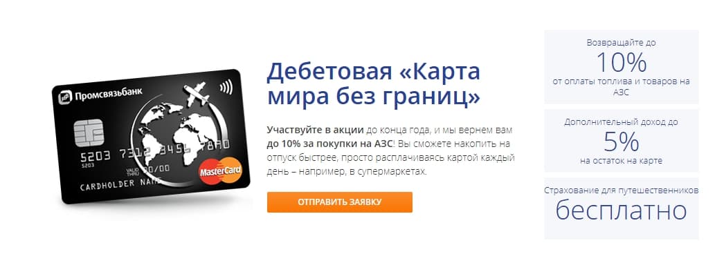- Оформить дебетовую карту в отделении «Промсвязьбанка».