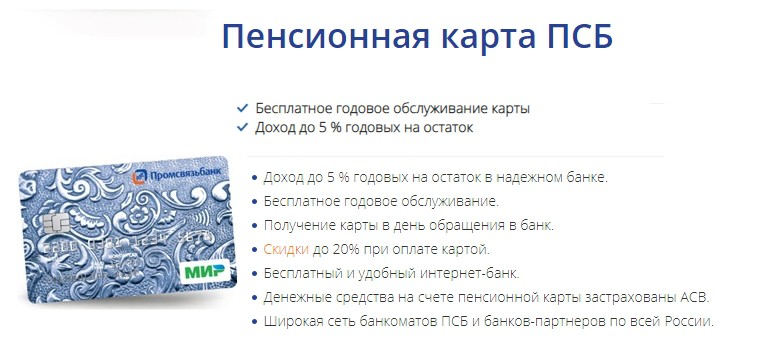 Клиентам «Промсвязьбанка», вышедшим на пенсию, важна возможность начисления процентов на остаток по счету для получения дополнительного дохода, а также предоставление бесплатного обслуживания. Эти требования объединяет в себе дебетовая карточка «Пенсионная».