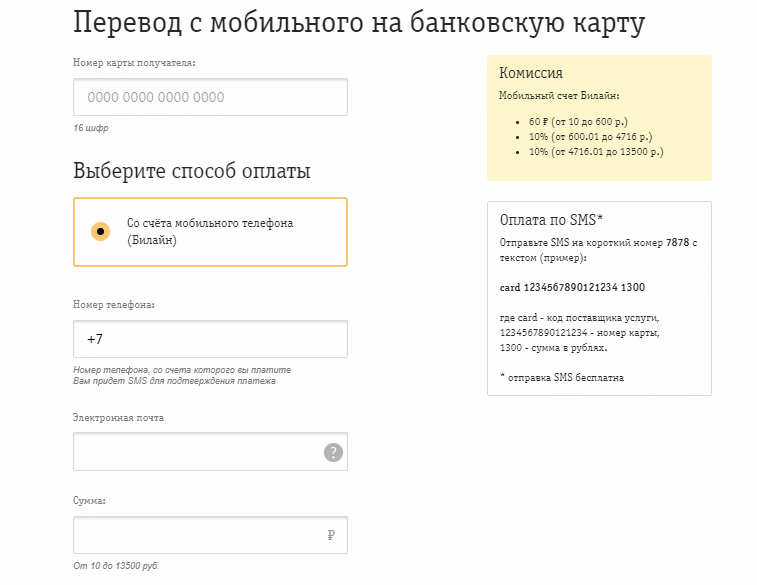 На сайте Билайн открыть «Оплата и финансы» и пункт «Денежные переводы». Там необходимо найти вариант вывода с баланса сотового номера на пластиковую карточку, а в открывшейся вкладке уже ввести информацию с пластика и номер телефона отправителя.
