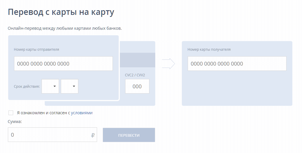 Выполнить это действие можно с картой любых банков, доступен сервис онлайн-перевода на сайте Промсвязьбанка. Для этого необходимо зайти по