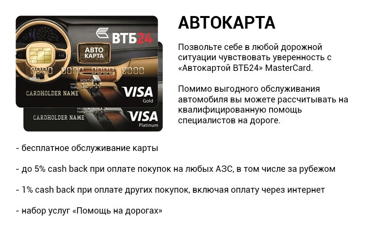 Автокарта от ВТБ подходит для клиентов, которые проводят большое количество времени за рулем. Она имеет следующие условия и возможности: