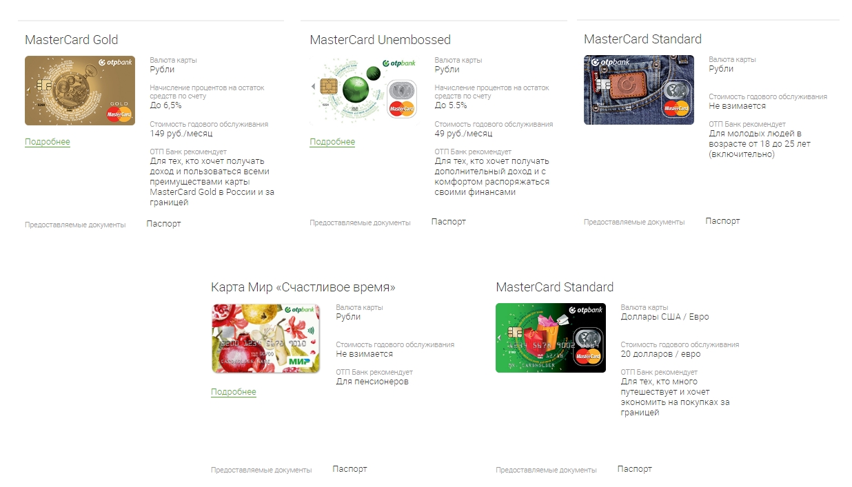 «ОТП Банк» разработал несколько видов дебетового пластика: MasterCard Gold, MasterCard Unembossed, MasterCard Standard в валюте, MasterCard Standard в рублях и карта Мир «Счастливое время». Все они отличаются выгодными условиями и тарифами, отдельные имеют депозит и бесплатное обслуживание. Какому продукту отдать предпочтение, зависит от цели использования и индивидуальных пожеланий каждого.