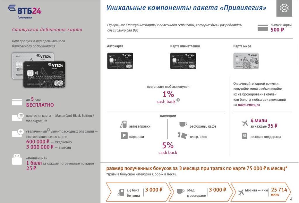 Пакет "Привилегия" от ВТБ - соотношение привилегированных сервисов и выгоднейших условий. Если вы подключитесь к пакету, получение услуг будет быстрым, комфортным и выгодным.