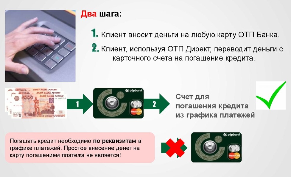Самый простой и очевидный способ внесения средств — это использование банкомата или терминала самообслуживания. Во всех стационарных отделениях банка «ОТП» расположены современные банкоматы с функцией приема купюр. Для работы с цифровым меню банкомата необходимо пройти авторизацию при помощи дебетовой или кредитной карты. При помощи банка можно не только перевести деньги на карточку, но и погасить кредитный платеж. Деньги, которые были внесены через банкомат до 17:00 в счет погашения кредита, будут зачислены на кредитный баланс на следующий рабочий день. При внесении денег после 17:00 — зачисление происходит на один день дольше.
