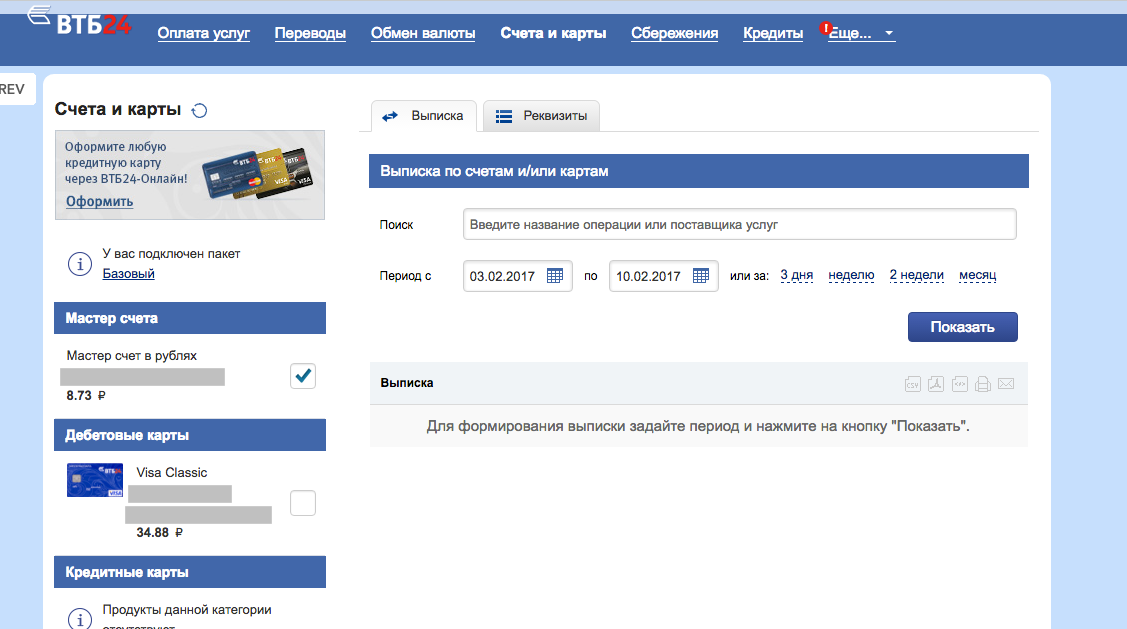 Выписку с карточного баланса проверить через интернет не трудно через личный кабинет системы ВТБ-Онлайн. Пройдя авторизацию, клиент следит за состоянием собственного счёта. На главной странице в разделе «Продукты» нужно зайти на вкладку «Выписка». На этой странице отобразятся данные о пятнадцати последних транзакциях. Для просмотра можно выбрать определённый период времени или, указав точную дату, конкретизировать данные по интересующей операции.