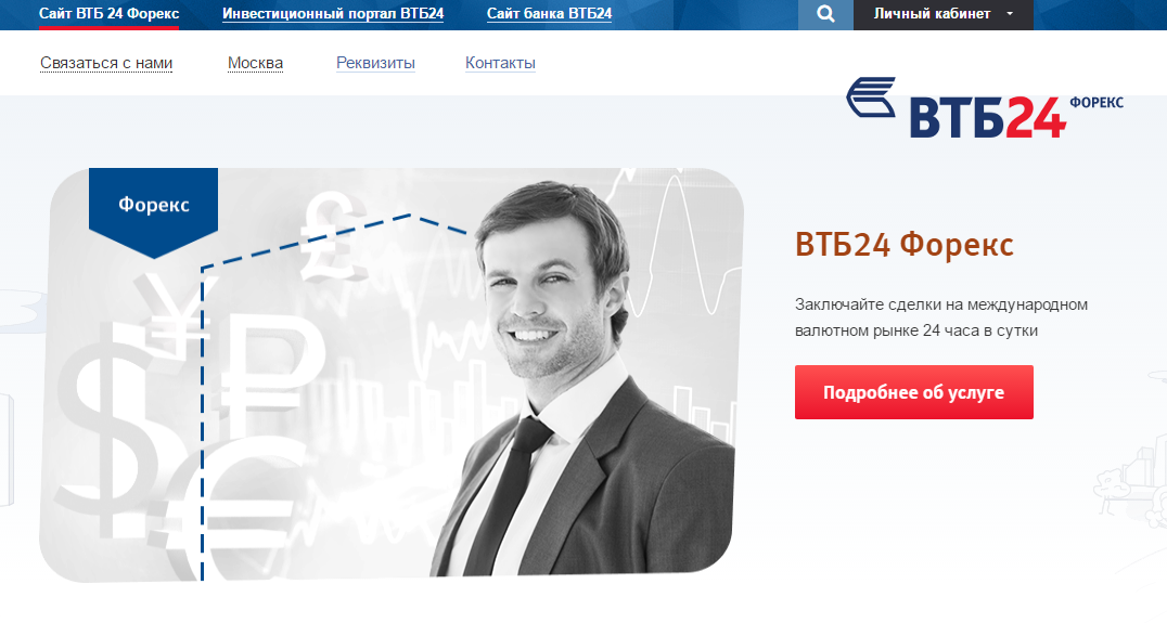 На Форекс через ВТБ возможна торговля акциями, облигациями, корпоративными ценными бумагами, опционами и фьючерсами. Работа построена на торговой платформе MetaTrader 5, OnlineBROKER, QUIK.