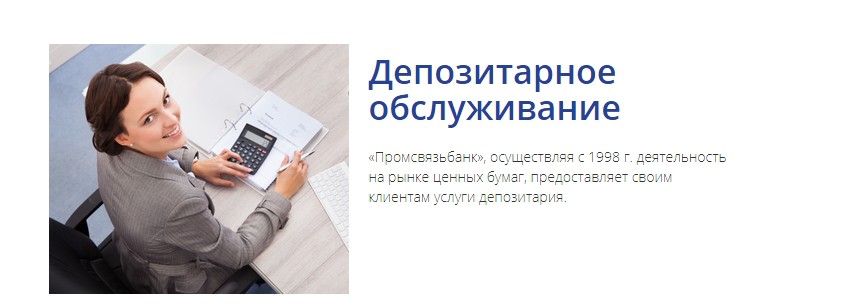 В качестве четвертого финансового инструмента представлен депозитарий. Вот уже на протяжении 20 лет «Промсвязьбанк» предлагает клиентам депозитарное обслуживание для оперативного решения любых операций с ценными бумагами: