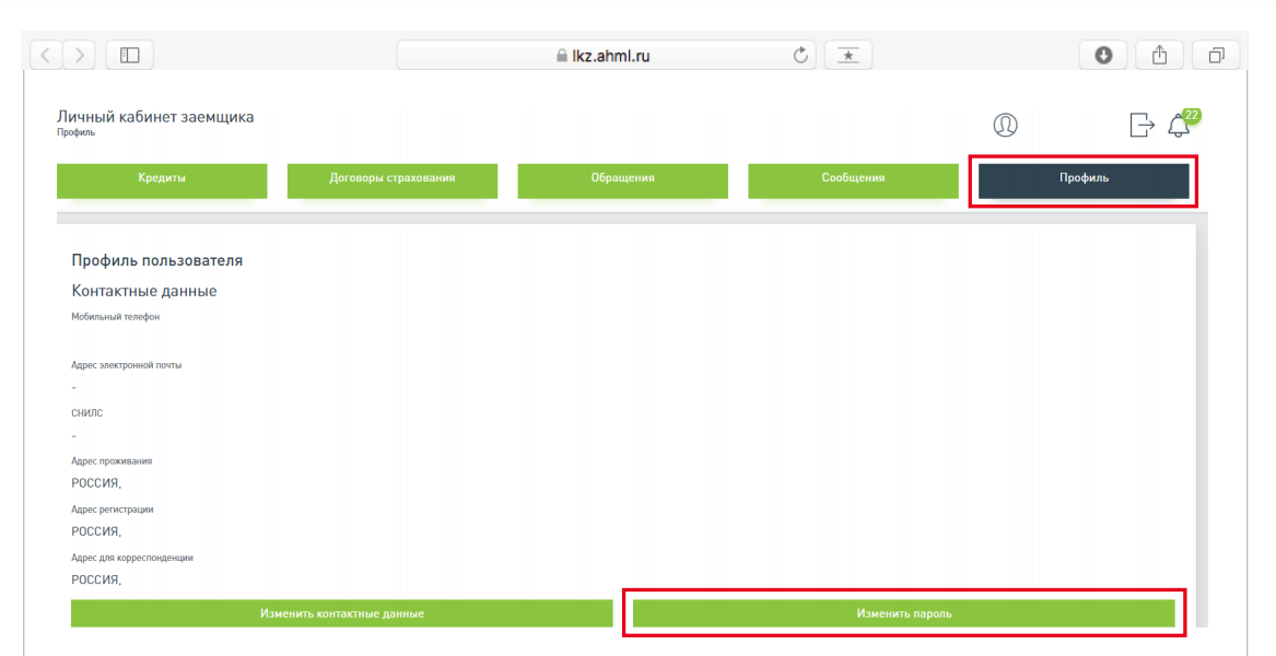 При начальном входе в систему АИЖК клиенту ВТБ предлагается сразу сменить временный рандомный пароль на свой. Это можно сделать в настройках системы, в разделе «Профиль». Там же можно изменить любые контактные данные: номер телефона, адрес электронной почты, номер СНИЛС.
