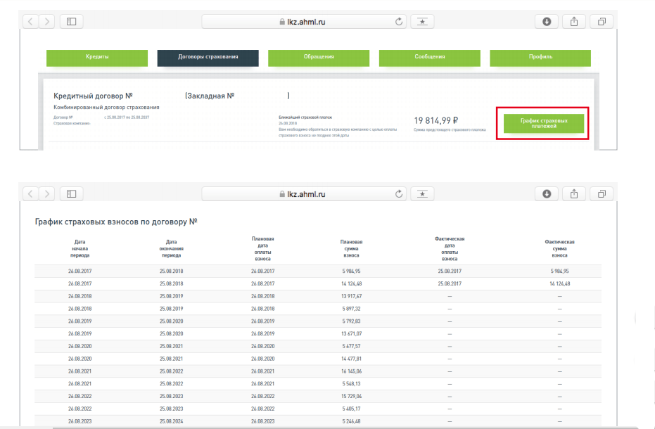 В этой вкладке можно увидеть всю информацию о страховых договорах: дата внесения платежа, сумма, номер договора и графики внесения средств.