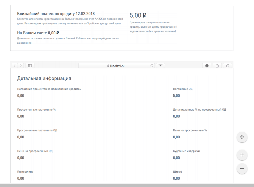 - Просмотр даты платежа и суммы внесенных средств доступен сразу при входе на вкладку. Данную информацию можно детализировать, если нажать на цифру следующего платежа: там располагается все данные о штрафах и просрочках.