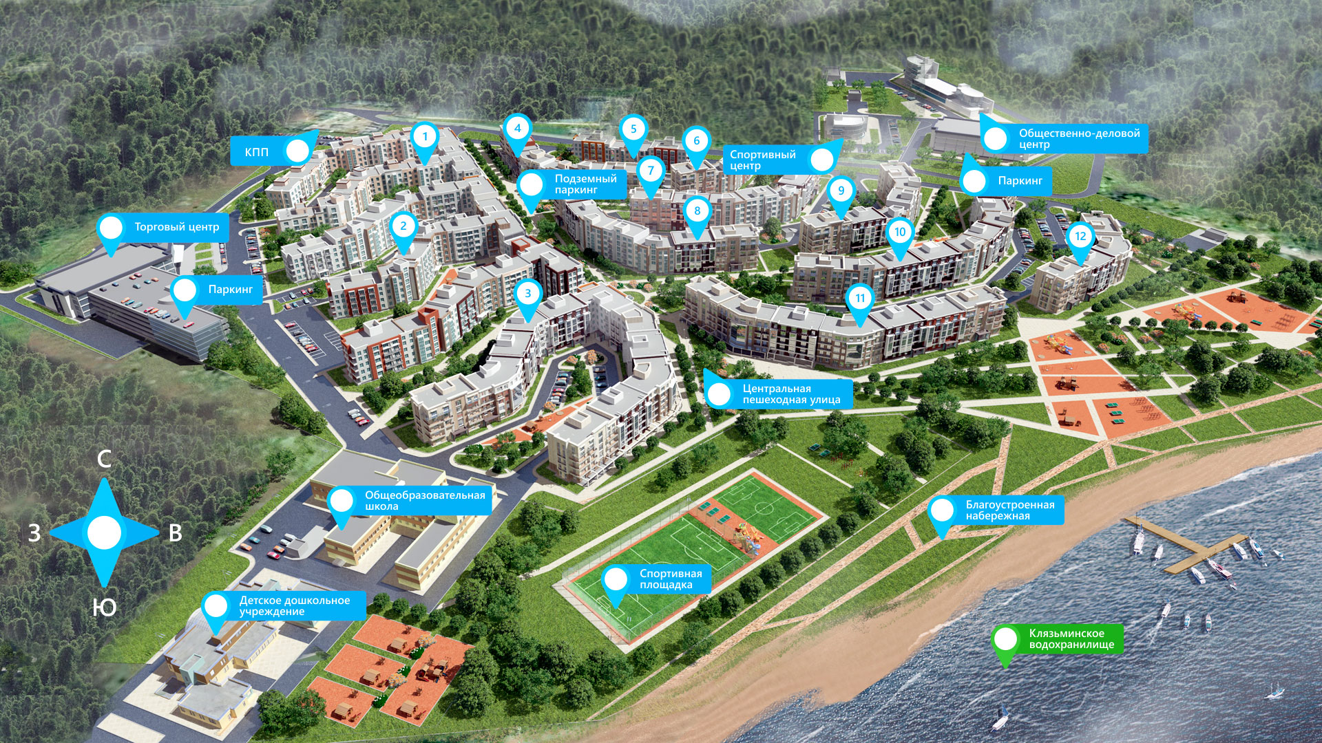В инфраструктуру жилого комплекса входит школа, детский сад, различные магазины, консьерж, детская площадка, фитнес, спортивная площадка, водоем и паркинг.