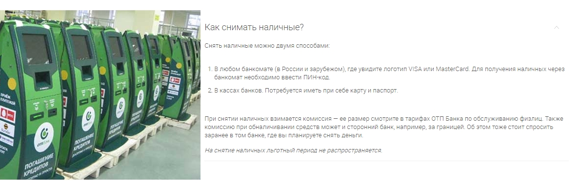 Первоочередное назначение кредитной карточки — это предоставление клиенту возможности производить безналичную оплату покупок, совершенных в интернете. Тем не менее владельцы карт «ОТП» могут обналичивать деньги в банкомате любого банка, который сотрудничает с МПС: Visa или Mastercard. При этом важно учитывать, что банк взимает более высокий процент за снятие наличных, чем за использование денежных средств при оплате онлайн-товаров.