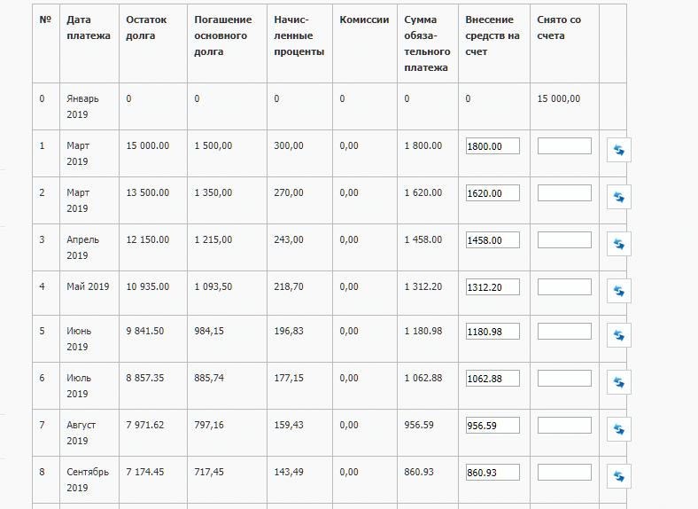- Ввести в специальном окне данные: одобренная процентная ставка, срок действия кредита, сумма использованных средств и процент ежемесячных выплат.
