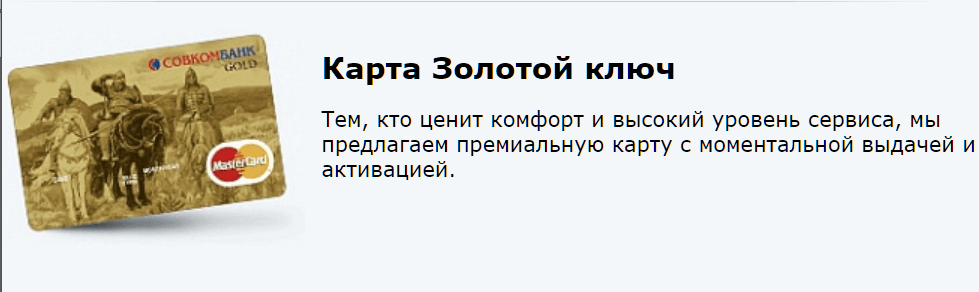 Получение кредита на карту Мастеркард осуществляется непосредственно в отделении Совкомбанка. Клиент приходит в удобный для него офис банка и обращается к любому сотруднику за оформлением карточки «Золотой Ключ» с моментальным решением.