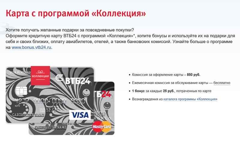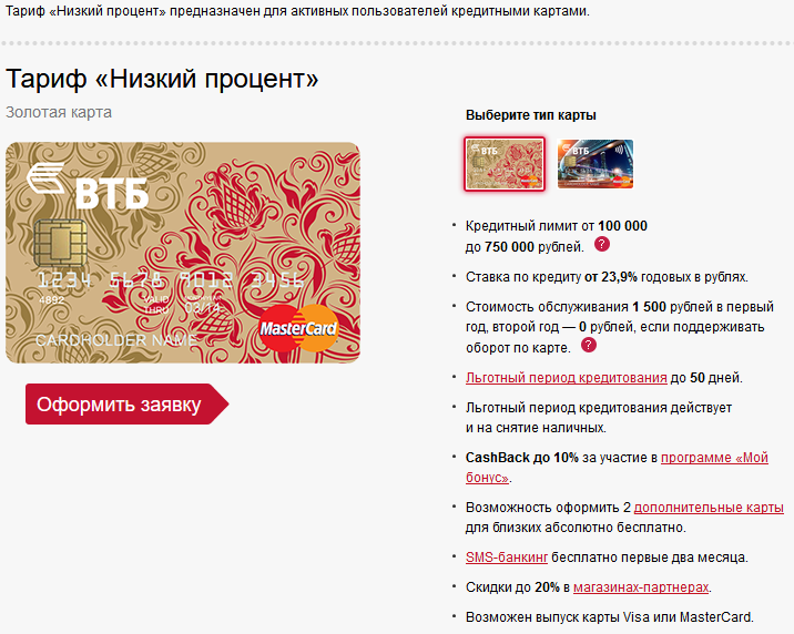 ВТБ позволяет пользоваться кредитными картами в любой точке мира, где присутствуют варианты оплаты Visa или Master Card. Открывать можно несколько типов карт: моментальную, премиальную карту, золотую и классическую.