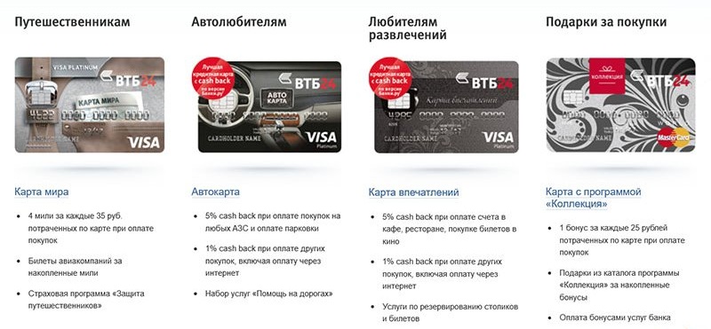 В банке ВТБ можно оформить кредитку «Коллекция». Она гарантирует своему владельцу большое количество бонусов от партнеров банка. При совершении различных покупок и оплате услуг, на счет будут приходить бонусы по тарифу 1 бонус за 30 рублей. Накопленные бонусы можно потратить на билеты в кинотеатр, на самолет или поезд, на броню номера в отеле и многое другое. Помимо этого партнеры ВТБ предоставляют скидку в размере 40%.