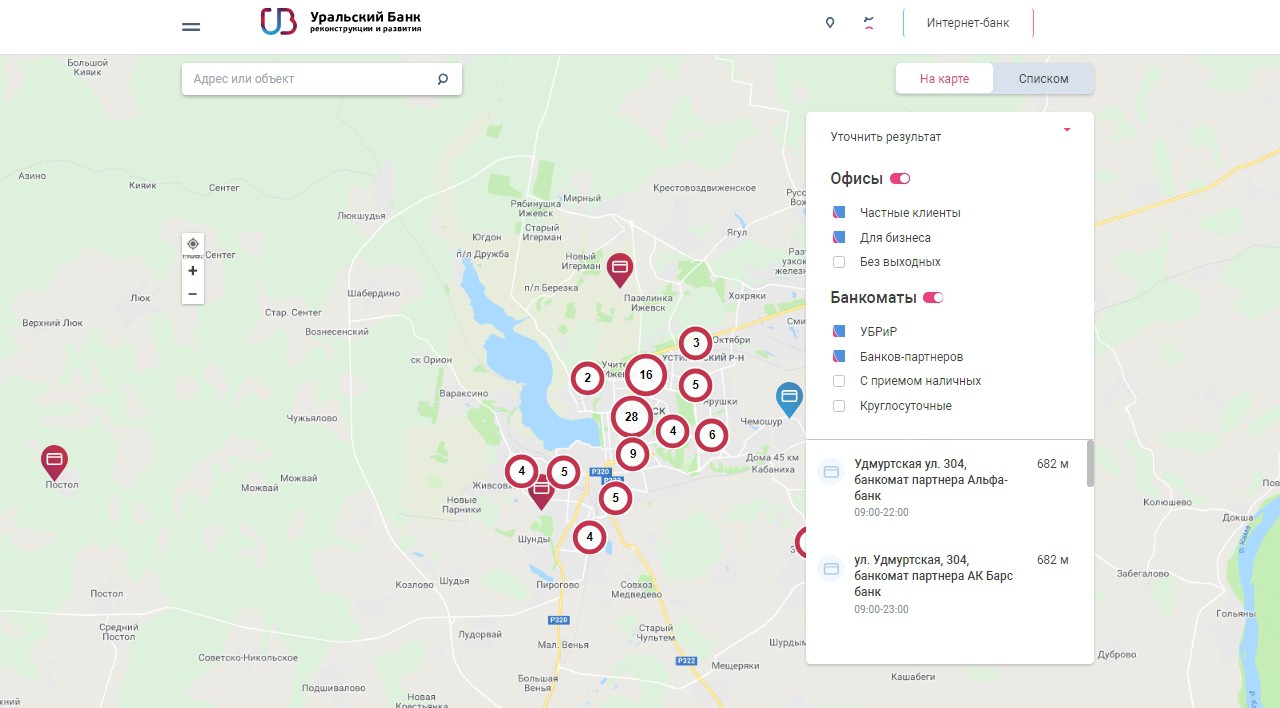 активной ссылке, можно в онлайн-режиме ознакомиться с полным перечнем отделений и банкоматов «УБРиР».