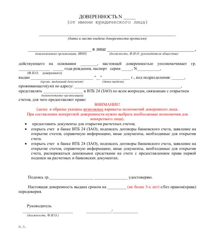 В стандартном бланке организациями для ВТБ должна быть указана следующая информация: город оформления, данные о доверителе (ФИО,дата и место выдачи, адрес проживания), разрешенные действия человека, имеющего данный документ от имени учреждения, дата выдачи и срок действия, заверение руководителем и доверенным лицом.