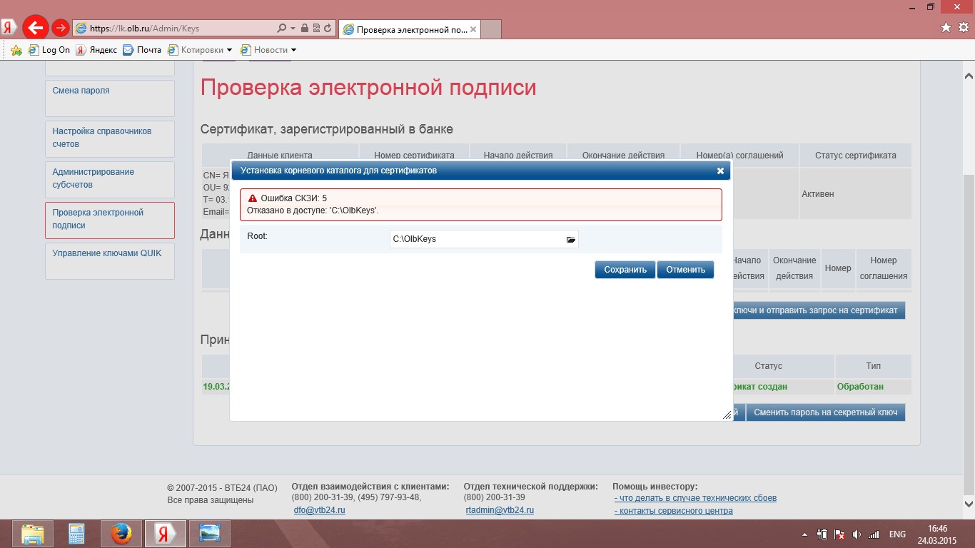 Для его действия в Личном кабинете сертификат нужно активировать в отделении ВТБ, предоставив акт ввода Сертификата ключа по месту открытия счетов. В итоге, ошибка «Файл секретного ключа не задан» ВТБ сервиса исчезает.