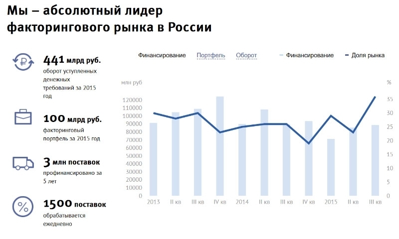 ВТБ предоставляет услуги факторинга с 2009 года и является абсолютным лидером на факторинговом рынке на территории России. О рекордах и достижениях говорят следующие цифры, рекорды и факты: