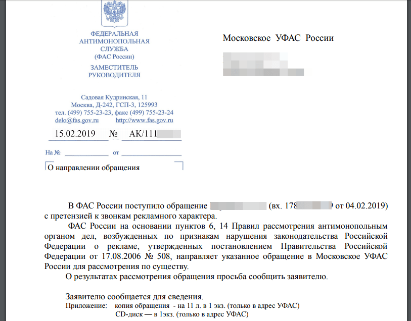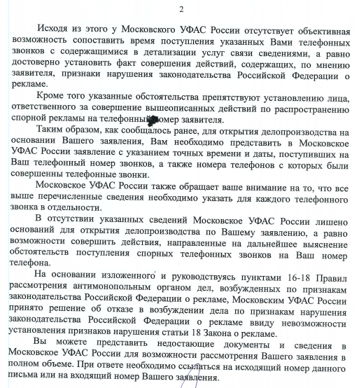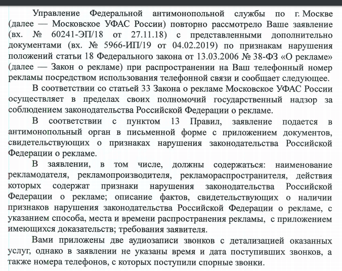 Сегодня с утра (7.03.2019) пришел ответ от ФАС, и что вы думаете? Они снова завернули моё письмо, я не указал в письме номера телефонов и время в которое был совершен звонок на мой телефон.