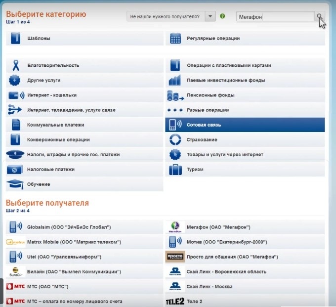 - Выбираем категорию платежа. Это можно сделать двумя способами: либо ввести в поиске наименование оператора, либо выбрать из предоставленного списка «Сотовая связь» и уже тут ищем оператора.