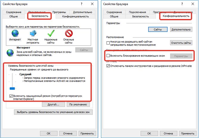 | Настройте безопасность браузера | Для этого откройте настройки браузера. В них следует выбрать пункт «Свойства браузера», а затем «Безопасность». Далее следует передвинуть ползунок на минимальное значение. В разделе «Конфиденциальность» следует отменить блокировку всплывающих окон. |