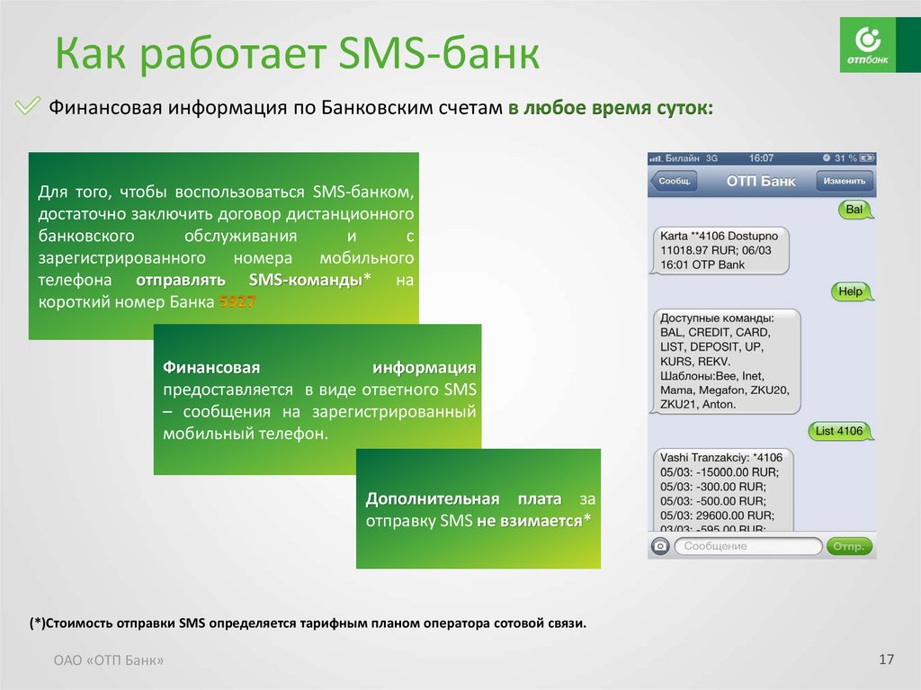 Услуга от банка «ОТП», позволяющая получать информацию и выполнять платежные операции посредством отправки sms-запросов, заслуживает внимания со стороны клиентов. Комиссионный сбор за пользование сервисом абсолютно лоялен при широком наборе функций.