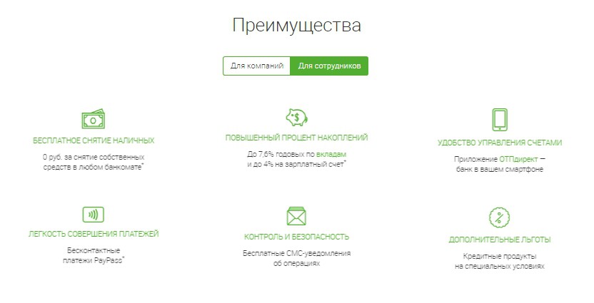 - Возможность оформления корпоративных карт для сотрудников и установка банкомата «ОТП» непосредственно в стенах офиса компании, что автоматически повышает ее статус.