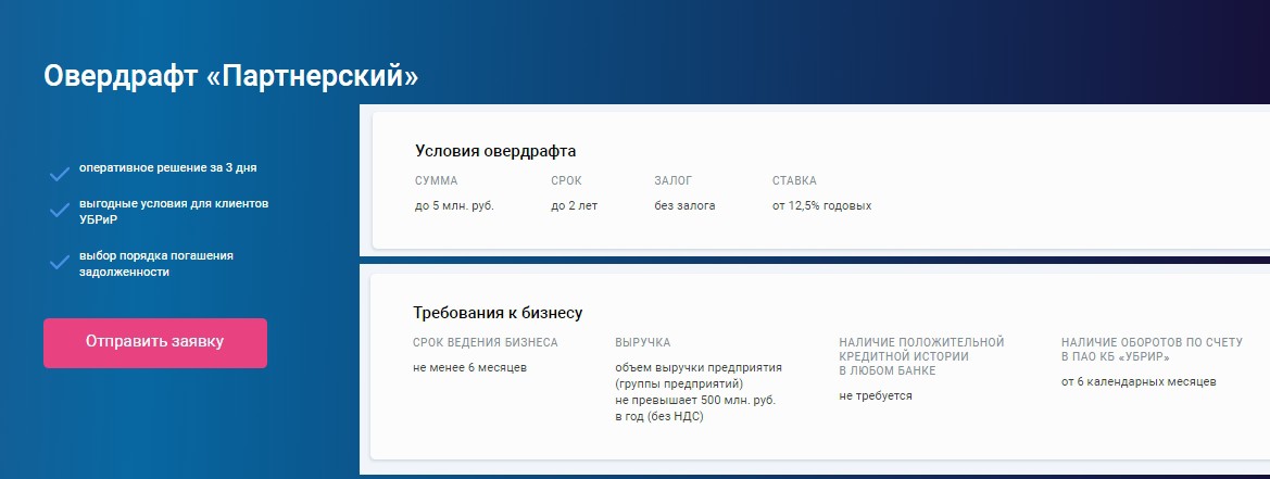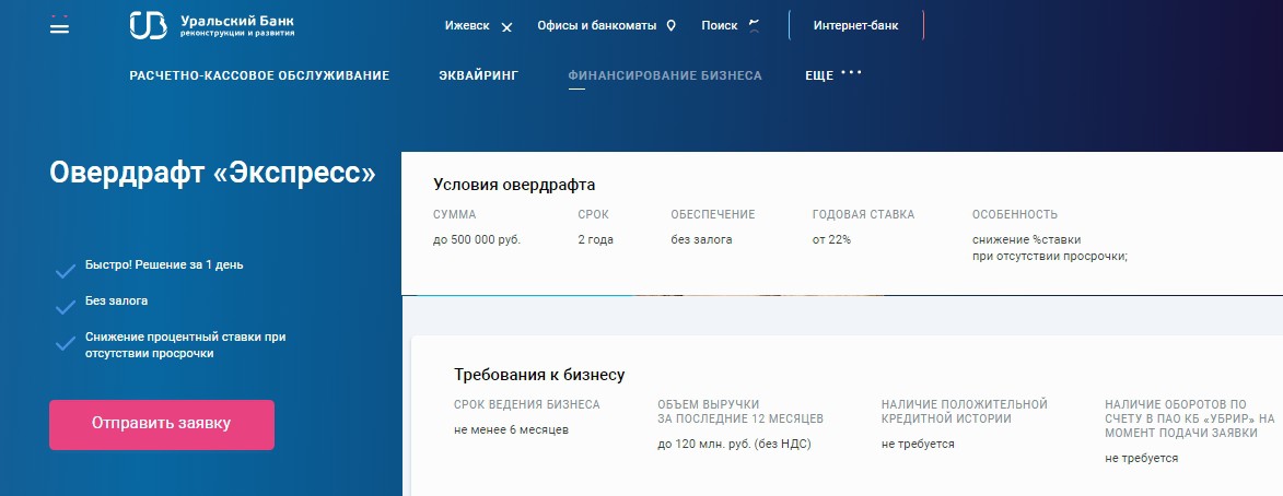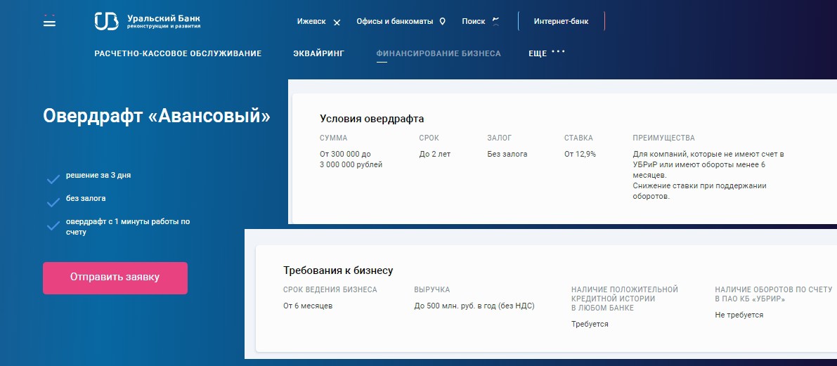 здесь. Подать онлайн-запрос для получения предварительного решения о возможности получения овердрафта можно на официальном сайте «Уральского банка реконструкции и развития», открыв раздел «Финансирование малого бизнеса» и заполнив анкету на странице с выбранным овердрафтом.