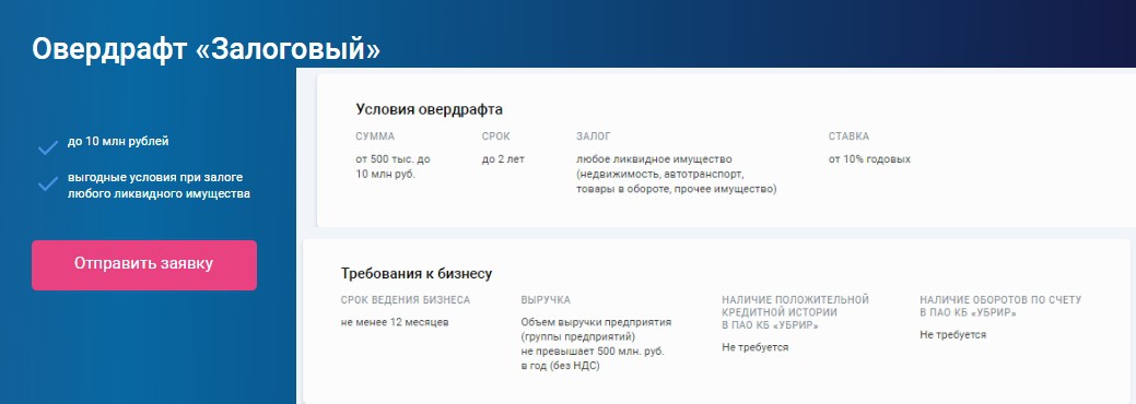 Данный вид овердрафта от «Уральского банка реконструкции и развития» предусматривает обязательное внесение любого ликвидного имущества в качестве залога. Рассмотрим перечень требований в рамках тарифа «Залоговый»: