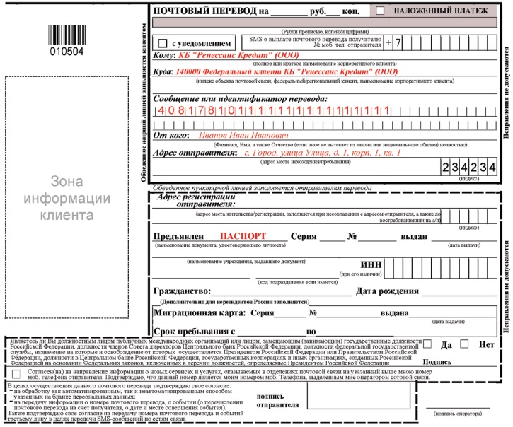 Клиенты банка, заключившие с «Ренессанс Кредит» договор займа, могут не только пополнять баланс личного счета, но и перечислять средства в счет погашения кредитной задолженности. Чтобы перевести деньги на личный счет, достаточно знать банковские реквизиты.