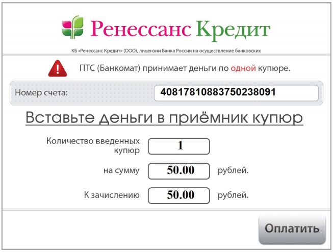 - Внести купюры и кликнуть на кнопку «Оплатить».