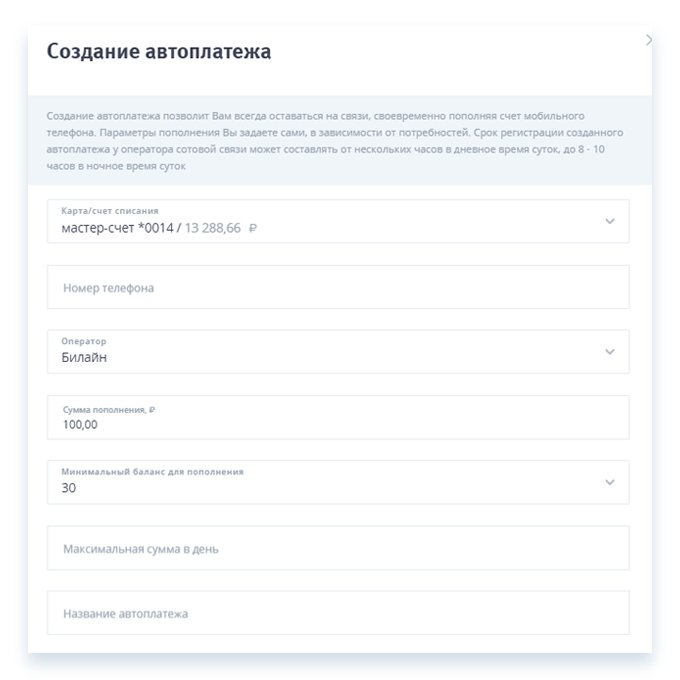 Стоит отметить, что подключить автоплатеж можно только в момент совершения финансовой операции. Таким образом, если в данный момент вы не планируете пополнять баланс телефона, то сохраните шаблон, а в момент проведения транзакции уже настройте автоплатеж. При необходимости отключить услугу можно в любой момент через личный кабинет.