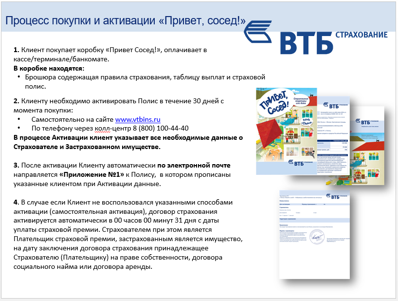 Стоит напомнить, что покупка "Привет, сосед" от ВТБ не означает, что ваше имущество застраховано. Обязательно нужно активировать полис. Это необходимо сделать в течение 30 дней после покупки полиса.