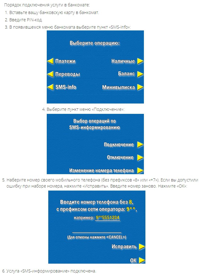 Также подключить сервис в любое время можно при помощи банкомата. Для этого необходимо выполнить простой алгоритм действий: