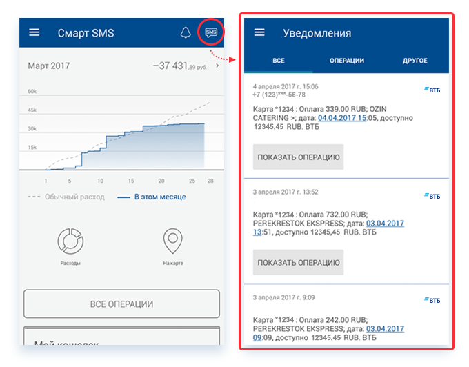 «Смарт SMS» позволяет отследить все транзакции, которые проходили по определенной банковской карте ВТБ и лимиты для нее. Пользователь может самостоятельно настроить порядок изображения и другие функции. Он также может скрыть карту в настройках в разделе «Банковские карты».