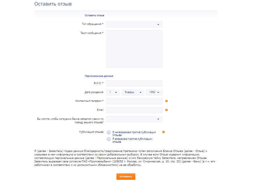 Все поля, отмеченные звездочкой (*), заполняются в обязательном порядке. Также все отклики проверяются на правдоподобность: если мнение клиента отрицательное, то Промсвязьбанк проводит проверку, принимает решение и проводит работу с менеджерами.