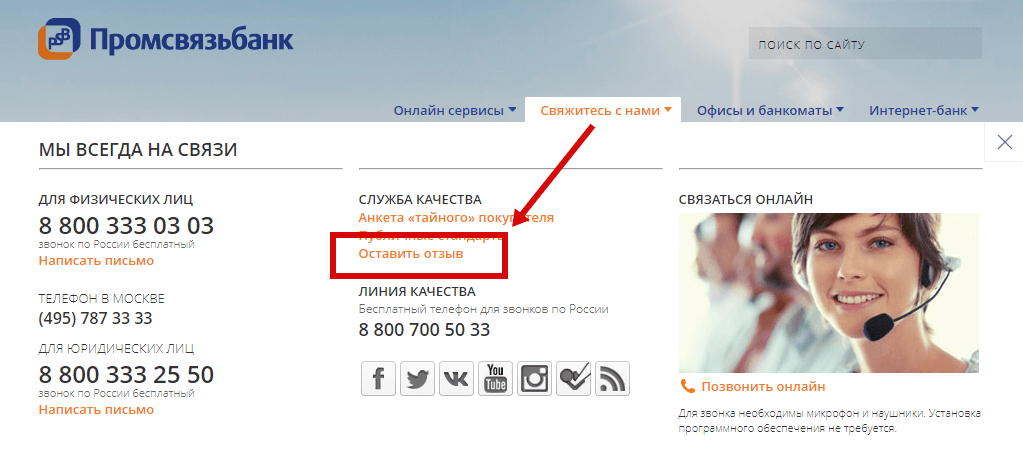 Самый простой способ оставить свое мнение является звонок и непосредственный разговор с сотрудником Промсвязьбанка. Для этого необходимо совершить вызов по номеру 8-800-700-50-33.