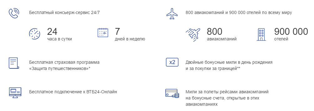 - Держателю премиальных продуктов ВТБ становится доступным консьерж-сервисом. Так, при возникновении каких-либо вопросов или трудностей клиент имеет право в любое время суток обратиться к персональному менеджеру для разрешения ситуации.