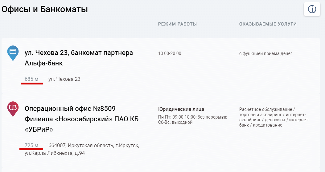 Далее для просмотра банкоматов и точек клиентского обслуживания, которые находятся рядом, необходимо нажать на кнопку «Офисы и банкоматы» и в списке отобразятся те места, которые находятся рядом с выбранным населенным пунктом. Расстояние до нужной точки указано под названием и адресом.