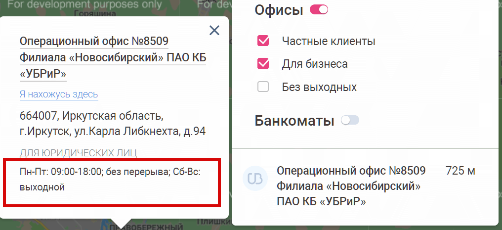Клиент может выбрать удобный режим для отображения: в виде карты с отметками или списка. Сайт покажет количество открытых офисов в городе, а так же отдельно время работы каждого. Увидеть это можно, нажав на значок с логотипом УБРиР на карте или выбрав в списке удобный финансовый дом для посещения.