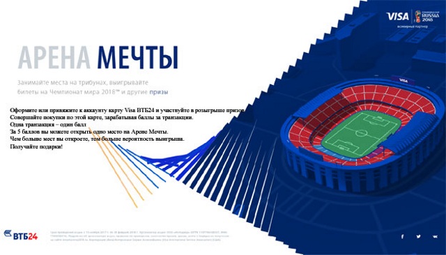 ВТБ и Банк Москвы Как говорилось ранее, на январь 2018 года запланировано присоединение ВТБ 24 к ВТБ. О многих новых акциях на сегодня неизвестно. Тем не менее, подробности некоторых акций уже открыты. Одна из них - акция "Арена мечты". Воспользоваться этим специальным предложением можно до 31 июля 2018 года. Суть акции заключается в возможности оформить специальную Мультикарту. Расплачивайтесь ей и копите специальные баллы. За каждые 5 бонусов вы можете попробовать отыскать одно место на арене. Соответственно, чем больше таких мест вы откроете, тем больше вероятность выиграть билеты на чемпионат мира по футболу 2018. Акция арена мечты ВТБ Главный приз акции - 2 билета на групповой чемпионат. Также можно выиграть следующие призы: