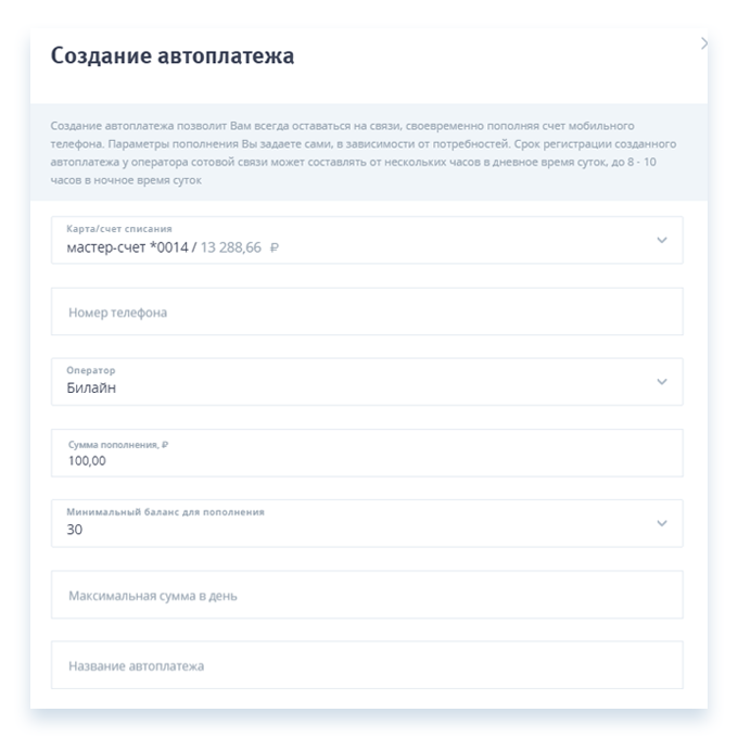 Средства на мобильном телефоне имеют свойство заканчиваться в самый неподходящий момент. Чтобы не остаться без связи с внешним миром, стоит подключить сервис для создания автоматических переводов «Автоплатеж за сотовую связь». Пополнение счета будет происходить тогда, когда баланс телефона достигнет финансового показателя, установленного клиентом. Сегодня подключить сервис могут абоненты таких операторов как «Мегафон» или «Билайн». «Автоплатеж» ВТБ 24 распространяется и на МТС-карты.